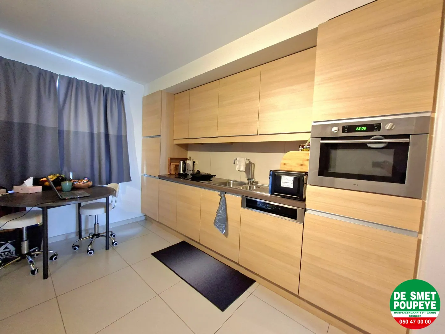 - open ingerichte keuken : dampkap, keramische kookplaat, combi-oven, frigo, vaatwasmachine en eethoek