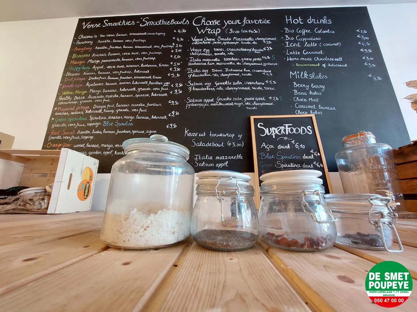 Dit pand is momenteel een take away smoothies/sap bar & broodjes/wraps concept healthy foods en superfoods.