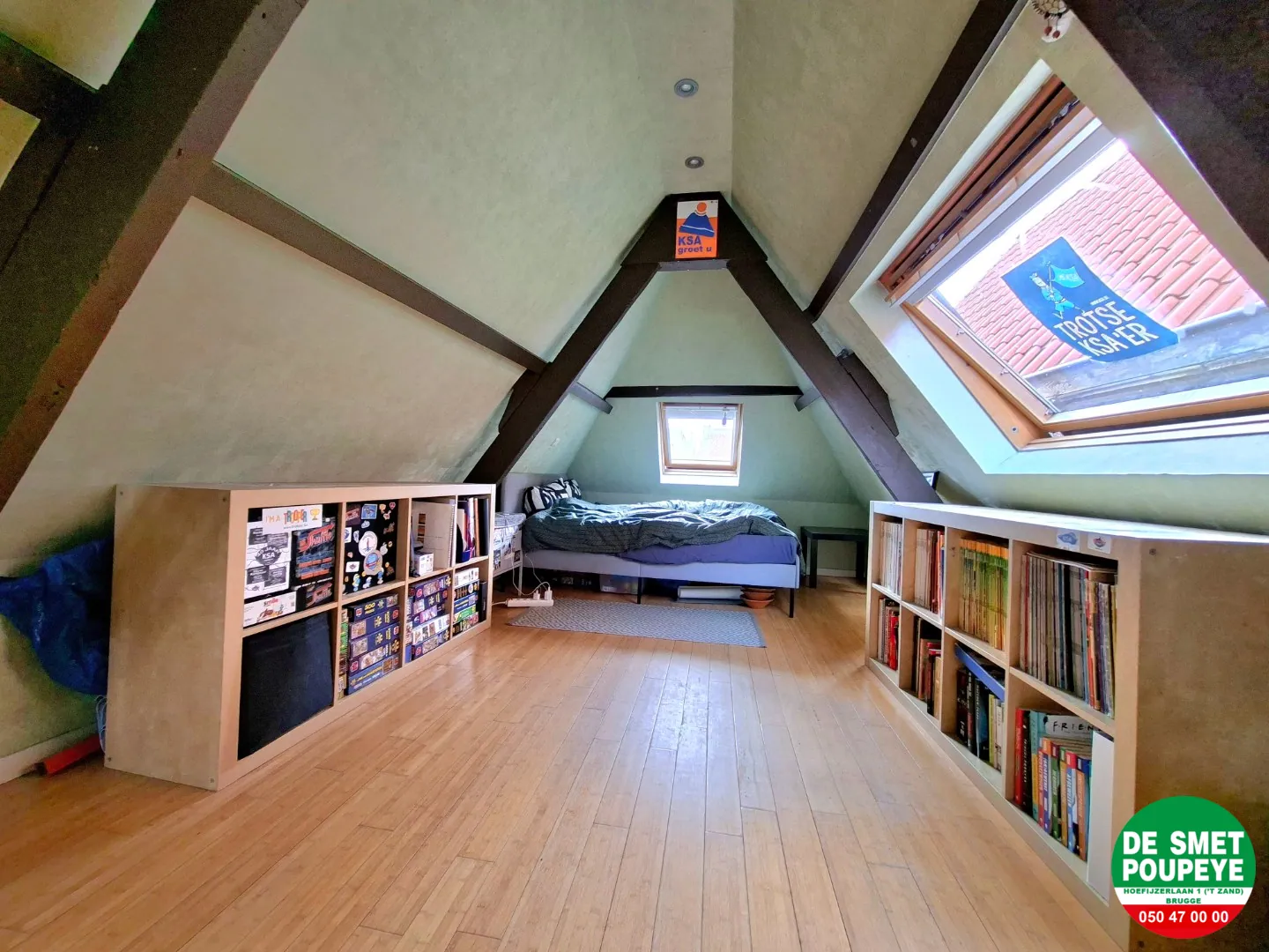 - 1 slaapkamer (laminaatparket): 8m x 3,50m met zichtbaar dakgebinte