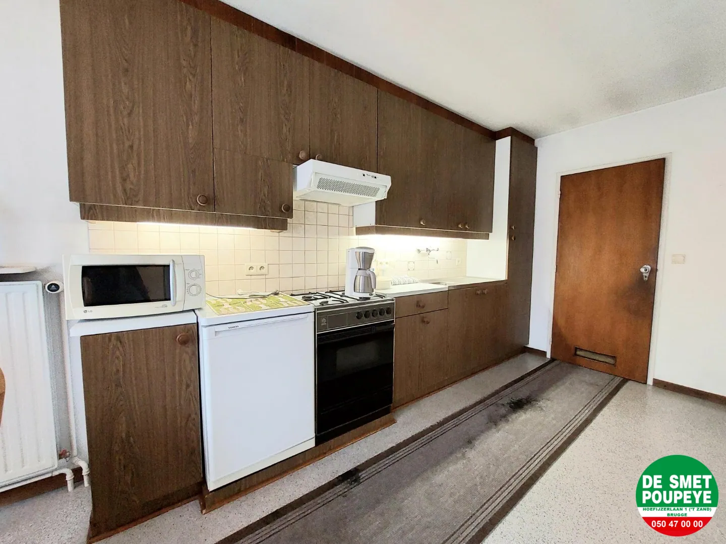 inkom met toilet en vestiairekast / living (vinyl) / ingerichte keuken (dampkap, keramische kookplaat en frigo) met eethoek / berging aan de keuken / badkamer (lavabo, ligbad-douche en aansluiting voor wasmachine) / slaapkamer 1 (vinyl) : 2 pers. / slaapkamer 2 (vinyl) : 2 pers. met ingemaakte kast