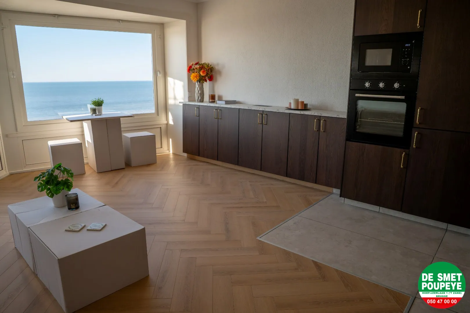 Dit appartement werd volledig vernieuwd in 2026 en is gelegen op de 6e verdieping met een prachtig zeezicht. Aan de living is er een balkon, verder is er een open ingerichte keuken, badkamer met inloopdouche, 2 slaapkamers, terras en private kelder. Gunstig EPC, goedgekeurde elektriciteit, asbestveilig, keuring en vergunning toeristische logies met 6 slaapplaatsen,... (sted. inl. in aanvraag).