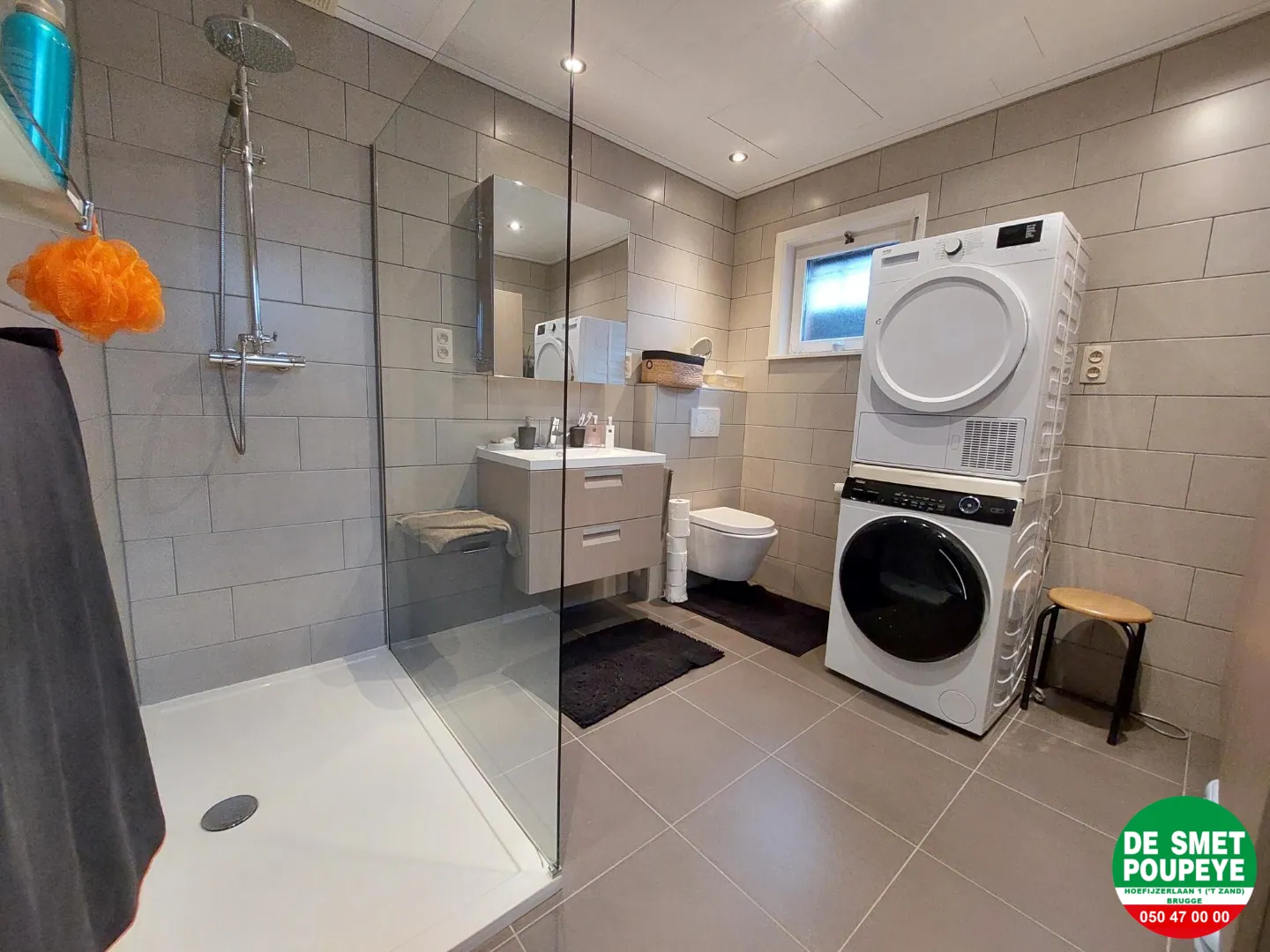 gelijkvloers : ruime inkom met ingemaakte kasten, living (tegels) met open haard met inbouwcassette op gas, ingerichte keuken (dampkap, gaskookplaat, oven, frigo en vaatwasmachine) / badkamer (lavabo met meubel, inloopdouche, toilet en aansluiting voor wasmachine) / terras en tuin met tuinberging en uitweg voor fietsen