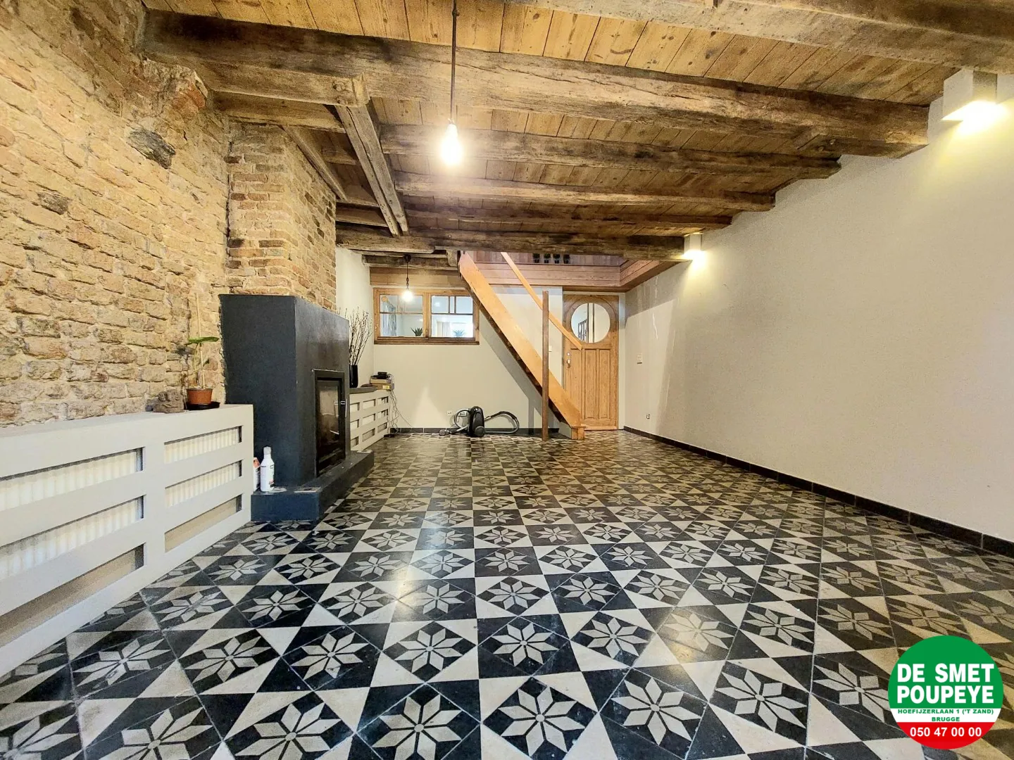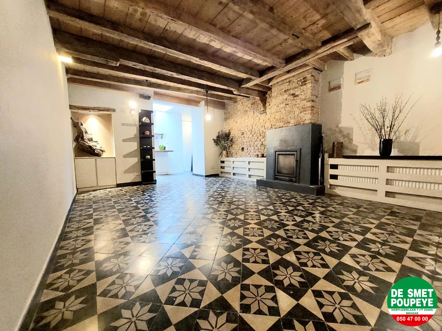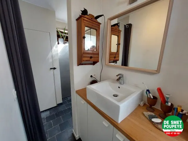Gelijkvloers : inkom / bureau of slaapkamer 1 (vloertegels): 2m75 x 4m15 met ingemaakte kasten / living (vloertegels en balkenplafond): 4m x 6m met houtkachel / ingerichte keuken met dampkap, kookplaat, oven en frigo / badkamer met ligbad- douche en toilet