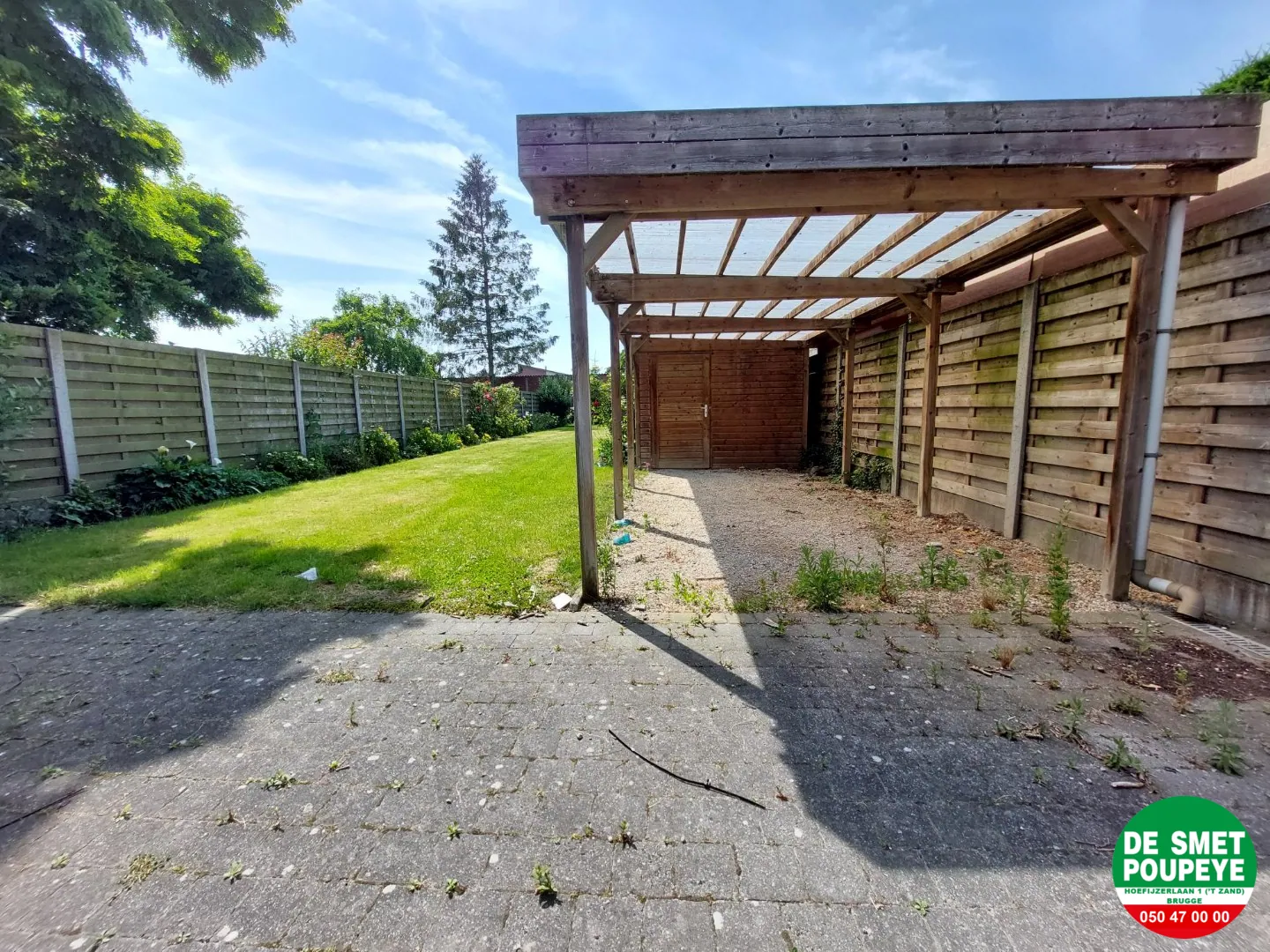 * terras en tuin met carport en berging