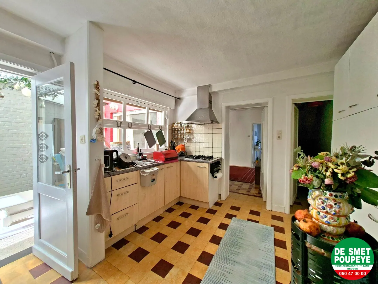 - ingerichte keuken : dampkap, gasfornuis en eethoek